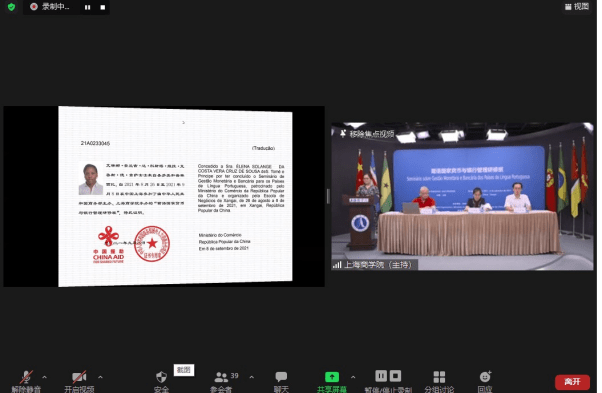 On the night of September 8, 2021 Beijing Time, the closing ceremony of the “Seminar on Money and Banking Management for Portuguese-Speaking Countries”, sponsored by the Chinese Ministry of Commerce and undertaken by the MOFCOM Training Base for International Business Officials (Shanghai) was successfully held online. Fang Meng from the Foreign Economic Cooperation Department of the Shanghai Municipal Commission of Commerce and Dai Ying, Deputy Dean of the Faculty of International Education, SBS, attended the closing ceremony, and delivered their speeches.
