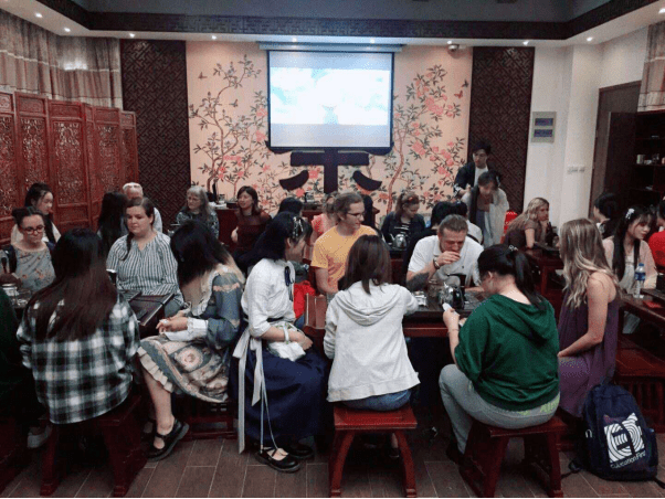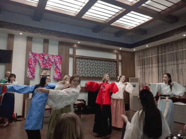 参观结束后大家到茶艺室活动,歇息,由茶艺社成员为大家泡茶,边品茶边欣赏汉舞,边听中国古典民族音乐,为了让外国学生更好地领略汉文化,汉服社成员让学生们穿上汉服,带领他们跟着古典音乐学习汉舞。