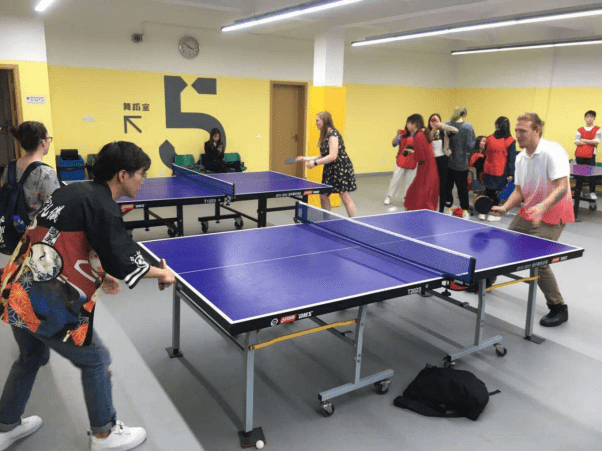 (图为乒乓球馆内中外学生组队比赛)