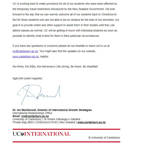 我校长期合作伙伴新西兰坎特伯雷大学国际交流与合作负责人Ian MacDonald博士,近日通过信函我校全体师生表达了诚挚的慰问和祝福,他表示你们并非孤军奋战,新西兰坎特雷大学将与你们以及你们的家人在一起。同时坎特伯雷大学将尽最大可能照顾好我校在新学生,为他们提供帮助和支持。Ian MacDonald先生信中用毛利语向我们表示诚挚的祝愿:Kia Kaha(加油!)