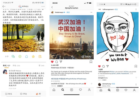 (图为美国西弗吉尼亚大学交流生在国内外社交媒体上为关心国内疫情而表示鼓励的留言)