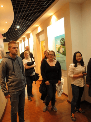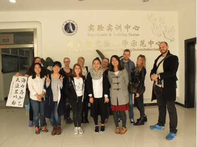 交流团于早上9点到达奉浦校区,国际教育学院俞益雯向他们介绍了我校发展历史及校园文化。接着,交流团和本校韩国留学生一起体验了一堂汉语课。随后,他们参观了教学楼,实训楼,图书馆等学习场所,体验了健身房,学生食堂等生活设施。他们还和在校留学生就学习生活方面进行愉快交流。最让德国师生们惊奇的是位于学校实训楼内的商业文化展示馆,引得同学们连连赞叹。最后,大家来到了茶艺室,在志愿者同学们的帮助下兴致勃勃地体验了一把中国书法,并带回了书法老师——日语系许乐同学的作品做留念。