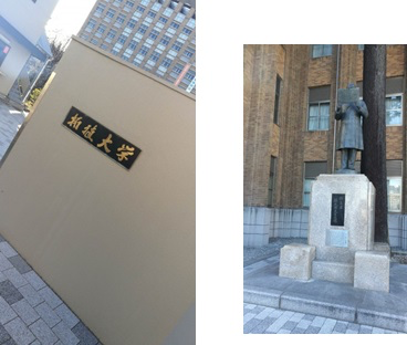 图为拓殖大学校门和创立者雕像