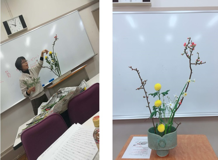 在老师的指点下我们尝试自己动手插花,(左图为老师作品,右图为我们的作品)