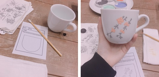 第二天我们集体驱车前往佐贺县西松浦郡有田町,去体验“有田焼き絵付け”,我们在各自的小杯子上绘制自己喜欢的图案,我自己画上了两支樱花(见下图),在最后的送别晚会上,烧制好的陶瓷杯子送给我们作为了临别礼物,上了釉的杯子更加光亮,颜料也更加鲜艳。