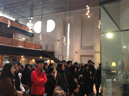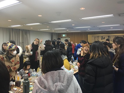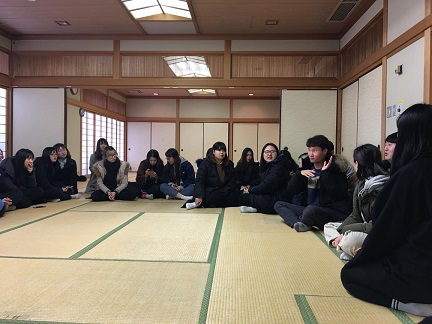 稍晚的时候韩国交流学生也抵达了活动中心,大家在一起做了很多小游戏,在愉快轻松的氛围中了解了彼此。晚上是welcome party,大家与各自的homestay家庭相聚古贺道场(见下图),偌大的道场充满了欢声笑语,大家都很开心激动。