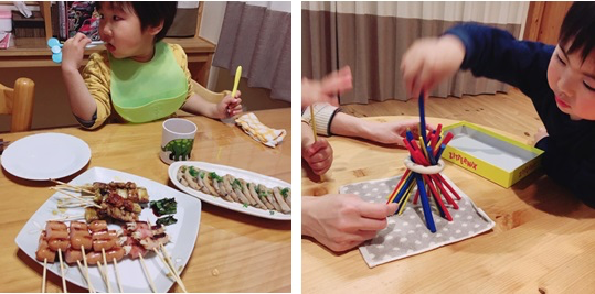 一天的行程又在暮色苍茫中结束了,我们在活动中心等待各自的家庭来接,仿佛又回到了小时候,等待“爸爸”“妈妈”把放学的我们接回家。回家之后,我与homestay的家庭共度了晚餐,美香夫人的料理非常可口。饭后小运动是和可爱的拓海和陸人玩起了小游戏(见下图)。
