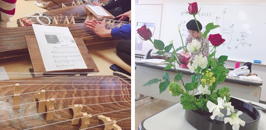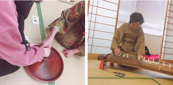 我们品味了工序繁琐却甘醇美味的抹茶,当然礼仪也要学习,我们端端正正跪坐在草席上,许久未动的我已感到双腿酸麻,老师也间或让我们放松一下,再继续介绍茶道。古筝弹奏的体验颇为生动,我们每个人都尝试弹了一曲《さくら》,更有韩国学生与老师合作演奏了一曲《阿里郎》。