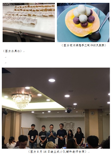 第四天和第五天是在校园内上很有意思的课程。第一节是手工蓝染,把一块白布用筷子、木片、橡皮筋、弹珠进行裹扎,然后在台湾特有的蓝染染料中三染两晒一脱水,酸碱中和后熨烫平整,裁剪涂胶水封书皮,成就了自己的花色笔记本。第二节课是拥有自己的罐头,第一个先做二重卷封的马口罐头,填充了低酸花生面筋罐头,体验一次密封罐头的操作,再麻烦小助手将我们的罐头进行两小时的高温消毒。此间另行制作了凤梨果酱罐头,自然冷却、冲洗冷却、翻来覆去再浸泡凉水,最终制成密封的果酱罐头。8月10号上午的课程是《理财大富翁》,作为一个现金流理财游戏,一开始的职业要好,要买车,要运气好多遇几回加薪,胆子要大进股市,少生小孩,才能走上人生巅峰!这个课程是唯一一门我觉得时间不够的,不仅玩的愉快,还能坐拥千万资产赢取大叶大学合作研发的面膜。但是下午的课程运动体育——瑜伽让我们体会到了生命中的许多不能够。两个老师分工明确,热身、正式瑜伽内容、放松一套流程下来,浑身酸痛。老师的瑜伽舞蹈兼具力量与美感,跟进音乐节拍,台下的我们像是僵硬的肢体不自然扭动者……总归欢乐无限、收获颇多。