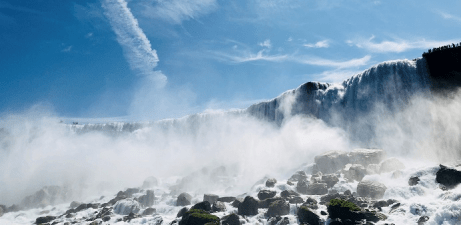 自然景观,我们去了世界第一大瀑布,Niagara fall。两个天然湖泊高度差形成的巨型壮观瀑布之间还有一架连接美国和加拿大两国领土的跨国大桥威严耸立在高空之中,赋予了这壮观的自然景观政治意义。有意思的是,同样开展游船旅游业的两国,用雨衣的颜色区分是哪个国家的观光船(船会离瀑布很近),红色的雨衣就代表是加拿大的船只,蓝色则代表是美国的船只。