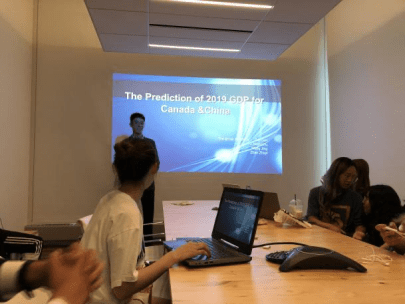 最后第二节课的时候Jonathan老师布置了一个Group Assistment,要求我们下载好加拿大和中国2017年以前的GDP数据,并对2017年的趋势进行分析,再制作PPT在最后一节课进行汇报。这对所有人来说都是一个挑战,本来在英文授课的过程中,大家也并不是完全理解教授的解释,现在还要设计到编写方程进行预测分析。印象很深刻的是,为了完成小组作业,我们所有的人都聚在一个房间里,一起熬夜讨论、上网搜索资料、分工合作,一直到凌晨两点,我们才各自回到自己的宿舍。这次的小组作业让我对团队合作有了更为深刻的认识,也是在那一晚的交流沟通之后,我和游学的伙伴们有了革命性的情感。游学之初不认识大家的陌生和不自在一扫而空。第二天由戴子安和李梦初各负责两个part上去pre的时候,我在下面播放PPT。戴从早餐开始把手机的文稿给我看,我做了一些修改,他从宿舍楼下背到教学楼,一直很认真地看着屏幕练习。而李梦初昨晚等我们汇出图已经是凌晨两点,他回去继续做PPT,准备稿子,听说第二天起来的时候腿上还抱着电脑。所有的人都只睡了不到四个小时就起来了,第二天,当我们真的来到pre的教室,我的内心为我们所有人感到自豪。尽管我们没有成功设计出方程,没有做出2017年以后的预测分析。但是经过这一次,我第一次这么深刻地感受到团队的力量。也坚定了自己一定要努力学习将来在国外读研究生的时候,才能很好地适应学生需要时常做pre的主动的学习生活。