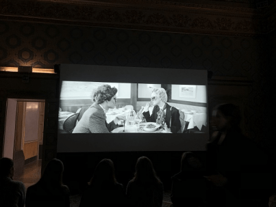 图为与同学老师一起展览观看影片