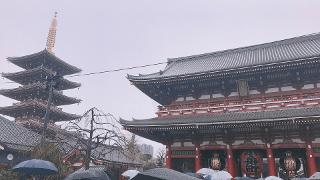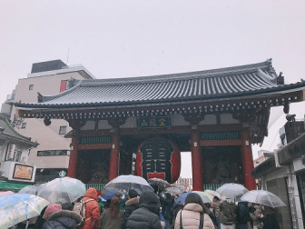 在三天的课程之后,我们迎来了双休日进行自由研修,与小组成员协商一致后我们搭乘电车前往了浅草寺。当天天空飘着雪,十分寒冷,浅草寺又在户外,很遗憾我们只停留了半天便回到了居所。但在研修过程中我们通过当地树立的告示板进一步了解了浅草寺的历史与发展,不枉此行。