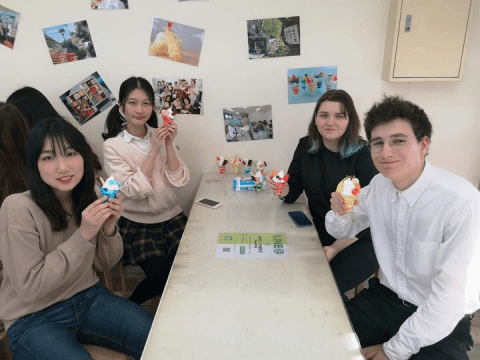 下午抵达日本,加藤老师赴约举着橙色旗子和两位俄罗斯同学一起等待我们。