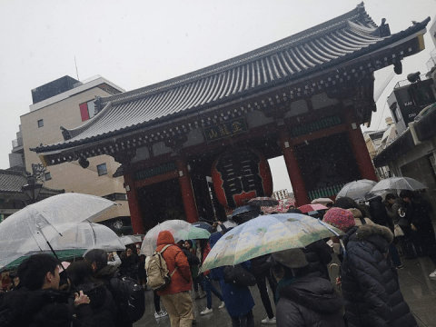 浅草寺位于东京都台东区,是日本现存的具有“江户风格”的民众游乐之地。其是东京都内最古老的寺庙。寺院的大门叫“雷门”,正式名称是“风雷神门”,是日本和浅草地区的象征。我们去的那天刚好碰上东京降雪降温,只能打伞进行拍摄。