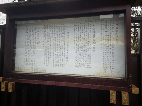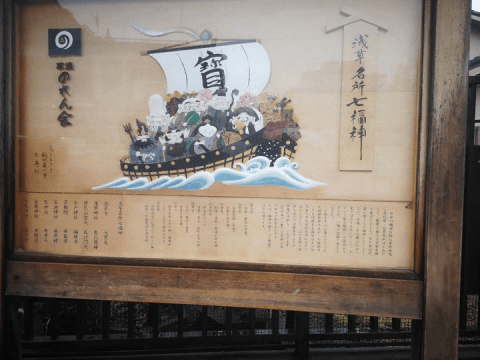 钻过雷门、通过仲见世商店街之后就是宝藏门。入母屋构造的二重门(2层建筑、外观上为上下二重门)。现在之门于1964年(昭和39年)再重建时以钢筋混凝土建造、由实业家大谷米太郎夫妻捐款兴建。门的左右置有仁王(金刚力士)像、之前名叫“仁王门”、昭和再重建后才称为宝藏门。其名来自门上层的文化财产收藏库。但由于天气原因当日浅草寺内部未开放,我们转换目标在外围通过展览牌了解“浅草名所七福神”的相关介绍和不同时期浅草寺相关见闻。以下为部分展览牌照片。