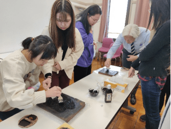 在课堂上,我们学到了许多以前未曾了解的日本文化。第一堂课是关于招财猫和商业,在这堂课上,第一次了解了招财猫的起源,也第一次知道了招财猫不仅可以招财,还可以聚缘纳福、趋吉避凶。而不同颜色、不同形态的猫咪代表的意义也是不同的。也学习了对现代日本商业影响深远的进江商人的十训。第二堂课则是深入了解了日本的文字、家徽和俳句。这些虽然也曾学习过,却并没有像这样深入。大家还尝试着写了一些自由俳句。第三堂课是插花,这对于大家来说都是第一次接触。在动手之前,老师详细讲述了关于日本花道的一些基础知识。之后,大家分组完成了自己的插花作品,取了名字,上台描述并解释了自己的作品。下课之前,还了解了日本人生活中的一些禁忌,尤其是看望病人时有哪些花不能送的,非常实用。最后一堂课是关于浮世绘,在讲述浮世绘之前,老师先引入了西方油画,再到印象派与浮世绘之间的关系,之后是浮世绘的制作过程。老师还拿出了自己的珍藏,这是第一次见到浮世绘的实物,可能也是唯一一次触摸这些具有百年历史的艺术。最后,老师带着大家一起体验的浮世绘的印制过程,录像上看着简单,实际做起来却是困难重重,各种问题层出不穷,少有成功的。