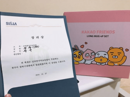 另外,我们还去观看了釜山烟花节以及和小伙伴一起去了海云台看海,品尝了釜山最有名的猪肉拌饭,烤鱿鱼,在韩国的一学期,使我受益匪浅,学到了除了韩国语知识以外的待人接物的方式等等,当我知道自己将要离开的那一天,不舍老师和同伴的同时回首这一个学期的点点滴滴,我拿到了包括基础课程和写作课的双全勤奖,并在韩语口语大赛上获得了三等奖的优异表现,自己的努力得到了回报,对于未来的目标也变得更加明确,从那时起我想要学好韩国语,想要更好的融入韩国的文化之中,毕业后我想我也会来韩国考研究生,未来路还长,加油吧,趁着青春还在,少年还在。