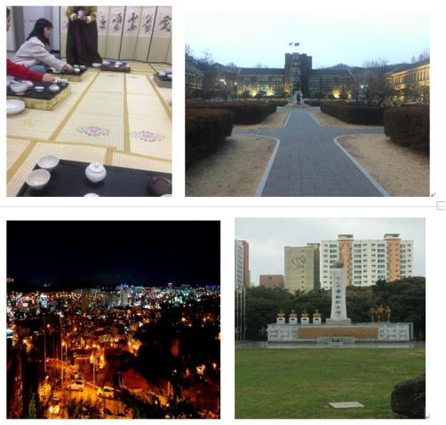 韩国给我的第一印象就是到处都是青山环绕,几乎都隐藏于群山之中,这是我在中国很少见到的,就算是居于城市之中的人们都可以随时随地享受绿水青山独特的美景和舒适的感觉。而每逢夜幕降临,学校附近就开始繁华起来,游戏机房、卡拉OK、咖啡屋、各种风味小吃、流行新潮的服务店等等应有尽有。尤其是与朋友一起悠闲地爬山,俯瞰美好的夜景,心情得到极大的放松,可谓是身心愉悦。其中让我印象深刻的莫过于其道路的陡,每当看到汽车基本倾斜的停在道路上时,都怕它突然打滑,不过多走走,利于锻炼身体。