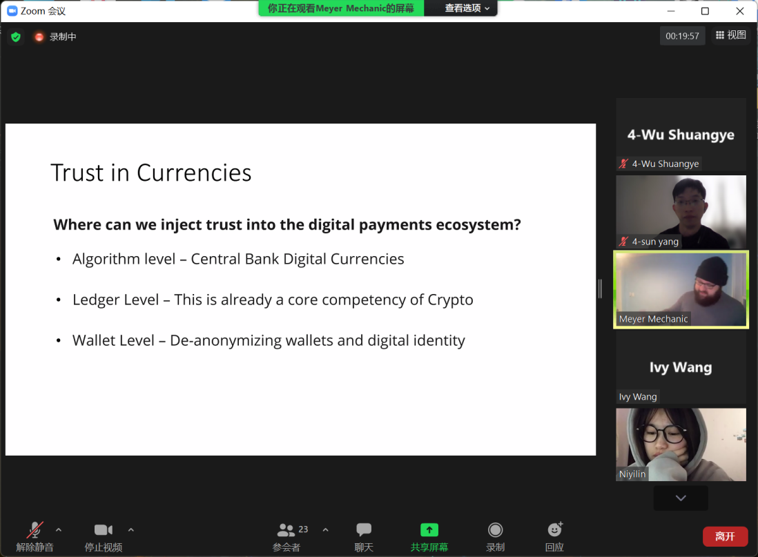 我也感觉到每门技术都有其迷人之处,区块链巧妙地设计与构思也使我感受颇深。但学习过程中也遇到了很多困难,大多是对英语化学习的不适应,有限的英语水平让我无法快速理解老师的讲解与问题。我也很难用英语即时地表达自己的想法。我感到很可惜,在今后的学习生活中也要提高对自己的要求。