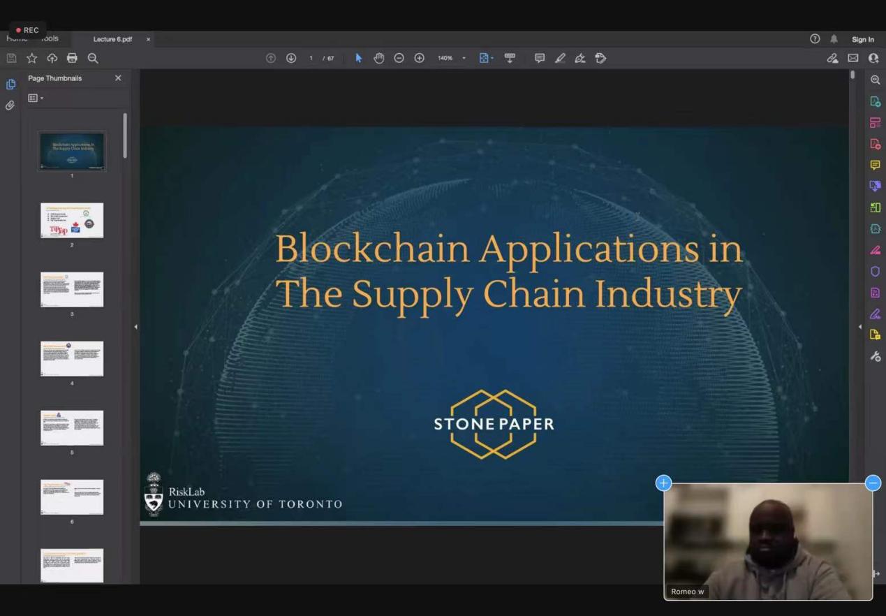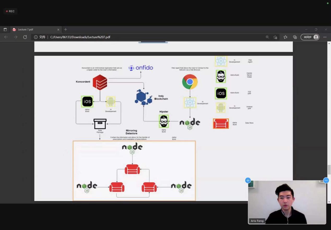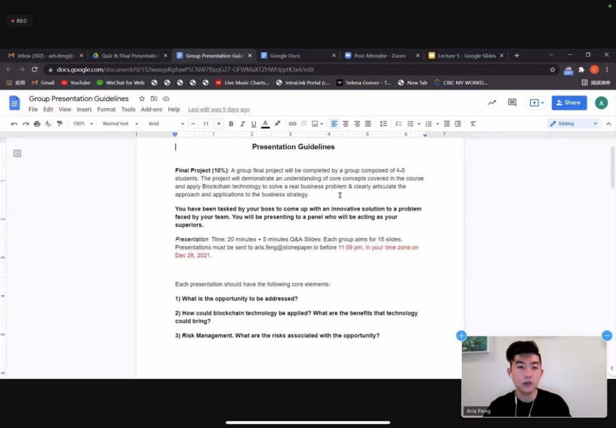 在之后的课程中是由Matthew Rappard教授、Romeo教授和Aris Feng教授三位不同的教授为我们授课,每位老师的上课风格都不一样,但每节课都互动性十足,因为是在线课程,不能和教授面对面学习,但是教授们都会积极和我们互动,随时询问我们是否有问题。教授们也为我们详细的介绍了区块链在医药,金融,食品安全等行业的应用,并给我们列举了很多了例子,这让我能更加通俗易懂的了解的区块链的应用是非常广泛的。这次的区块链在线课程对我来说不是枯燥的教学,而是向我们传达了更多的实例,如何利用区块链解决生活中遇到的问题,更好的激发我们独立思考的能力。并且在每周课程结束后,老师也会给我们布置作业,帮助我们回顾每周的知识点,巩固这周学到的知识,而且每次的作业大多数是开放式的问题,引发了我们更多的思考。最后在小组讨论中,Aris Feng老师也非常有耐心的一组一组的询问,解决我们的问题,为我们最后的presentation提出建议和指导,更好的帮助我们完成最后的presentation。