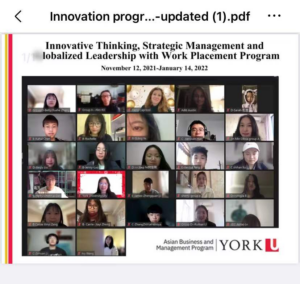 我很荣幸能够参与到加拿大约克大学在线课程培训的项目,这是一个十分完善的线上培训平台,结合了我们学校及约克大学的优秀教育理念,让我们能够有机会接触更多具有丰富专业经验的老师,虚心求教、积极进取。在这一段学习历程中,我们通过认真研读线上教材、聆听线上课程,学习到了许许多多关于我们自身专业领域的知识;同时在跟着老师的案例进行实践、研究的过程中,我们尝试将理论与实践结合,应用所学知识,完成了众多的案例分析,并且,在训练过程中,尝试锻炼了企业家思维、领导组织、创新思维与战略管理等各项有利于我们未来就业的能力;此外,我们还以小组的形式完成了老师布置的各项任务,在不断地磨合与成长中,我们也领会到了团队合作的力量,每一次的合作都在帮助我们更好地相互配合、提高工作效率,成为更具团队协作能力的人。
