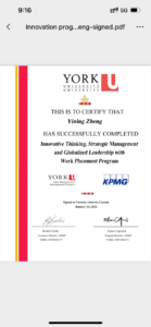 通过本学期参加的约克大学在线课程,我的创新思维与能力都在这一阶段得到了锻炼。通过几位老师给我们每周进行一次讲课,在跟随他们学习的过程中,除了专业方面的能力有所提升,我的语言表达能力和团队合作能力都随之进步,使我受益匪浅。