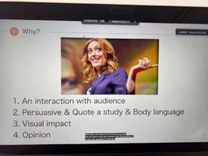 每节课我们都会有一个演讲环节,因此在刚开始上课时,老师便告诉我们应该怎样吸引停着的注意,这是在平常所学不到的,因此给了我平台去展示自己,学习到了演讲的技巧和如何运用感情,为我以后的演讲打下了基础。