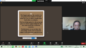 对我来说,最大的收获是我们了解到加拿大是如何认真对待食品安全的。在这个项目中获得的知识让我们对不同国家的法律和标准有了更好的了解。此外,我们还可以看到如何利用这些知识来改进中国的食品安全法律和实践。在今后的学习中我也会把所学知识运用到实践中去,继续努力学习。