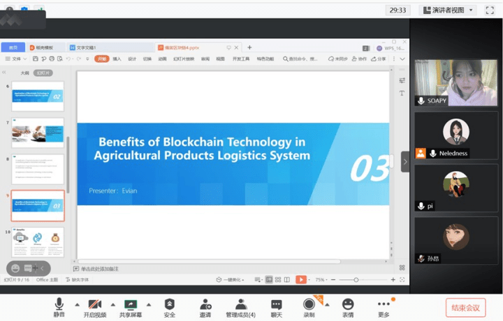 当然在区块链课程的学习中我也遇到了不少的问题,首先也是最重要的就是语言。其实英语最主要的是听力和口语,因为语言最终的目的还是沟通交流,英语学习已近十余年,但大多是以书写为主,在这一方面自认是存在欠缺的,尤其一时不适应教授的语速,无法快速反映,导致不知所云,课堂内容理解甚是吃力。既然产生了问题,就要想办法解决,于是我开始在提前预习课件,对于下堂课的内容有个大致的概念;私下询问了留学生朋友学习方法,学会在课堂上记录听到的关键词和短语,之后结合课件理解学习。其实前期预习和课后巩固无论是英语还是中文课程都是一种良好的学习习惯,应该得以培养,同时这也让我深感英语的重要性以及自己改进的方向,需要加强常态化的学习。还有一个令我影响最深的是最后的group presentation。尽管分组较为顺利,但前期由于对其要求并不清晰,在群里的互动性较低,迟迟没有拟定主题,因此我主动引导推进,逐一进行topic讨论、分工确定和时间规划,调动组员积极参与,打破僵局后一切也渐渐变得顺利。后续集中演练,共同找寻并解决问题,最终的呈现结果也不负努力,小组presentation除了个人能力的展示,主要体现的还是沟通交流与责任意识。