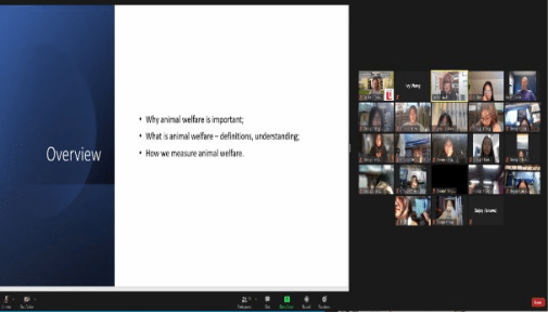 第四周项目邀请到Penny Lawlis女士,她是一家专业的牲畜审计公司的董事,有近38年制定动物福利政策和提供动物福利项目的经验。她是负责加拿大农场动物护理评估项目的发展委员会的成员,也是牧场动物护理技术委员会的现任成员。在课上我们了解到one health理念,它是对存在于生态系统、动物和人类之间的健康威胁的管理;它提出,人、动物和我们所在的生态系统的健康是相互联系的;one health不止控制人畜共患病。它包括粮食安全和粮食安全,可持续生产系统,生物多样性和遗传资源的保护以及人类与动物之间的福祉。提到农场动物福利,Penny介绍目前常用生物功能法,自然生活法,感觉法三者综合来定义和评估动物福利。这也是第一次让我们直观地发现动物福利与食品安全之间密切的联系:动物福利的系统测量减少对农场和植物动物的不当治疗,减少动物损害,以获得更好的质量、更安全的动物产品。