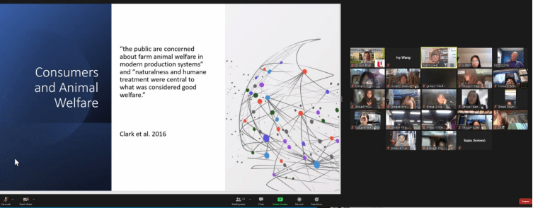 第4周,项目邀请到Penny Lawlis女士,她是一家专业的牲畜审计公司的董事,有近38年制定动物福利政策和提供动物福利项目的经验。她是负责加拿大农场动物护理评估项目的发展委员会的成员,也是牧场动物护理技术委员会的现任成员。在课上我们了解到one health理念,它是对存在于生态系统、动物和人类之间的健康威胁的管理;它提出,人、动物和我们所在的生态系统的健康是相互联系的;one health不止控制人畜共患病。它包括粮食安全和粮食安全,可持续生产系统,生物多样性和遗传资源的保护以及人类与动物之间的福祉。提到农场动物福利,Penny介绍目前常用生物功能法,自然生活法,感觉法三者综合来定义和评估动物福利。这也是第一次让我们直观地发现动物福利与食品安全之间密切的联系:动物福利的系统测量减少对农场和植物动物的不当治疗,减少动物损害,以获得更好的质量、更安全的动物产品。