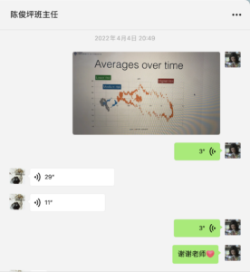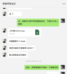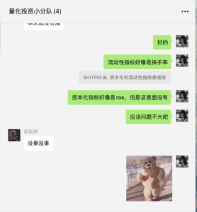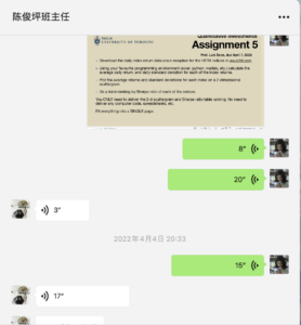 让我印象最深的还有教授布置的作业,其中一个作业用编程做起来比较方便,于是我去请教了我的金融学老师,她告诉我如何用编程完成,我们进行了几十分钟的讨论(如下图),最终解决了这个问题。期间我也想过网上找代做编程,我的老师说求人不如求己,反正以后肯定要学编程,不如自己把它搞明白。最后,我开始抽空余时间学习python。这也是这门课带给我的进步,这门课让我深深了解到自己所学还有很多的不足,我们都要不断的进步。