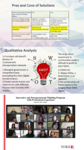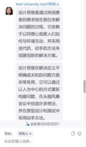 在过去的一个学期里,我很荣幸能得到这个机会参与约克大学的 ABMP—— 创新和创业思维课程与专业经验课程。过去的我在母亲的支持下也报名参加了不 少线下的或是线上的一对一口语练习,对于我来说,开口讲英语也许不是一件难 事,和一个与自己母语不相同的老师交流英语也许也不会太困难,但是,和小组 成员一起,用英语探讨陌生又新鲜的问题,或者是在和专业性更高的老师们用生 僻的专业名词、专业方法解决问题时是和我小时候“过家家”般上的口语小课堂 完全不同了。