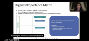 课程内容上,主要涉及了创新和创业思维的培养与运用,对企业进行研究与分析并进行创新性思考。总体来说,每个老师通过清晰地引入了课程主题,由浅入深地介绍了对企业进行研究分析的各种研究方法并带领我们进行创新性思考与改善。同时,还有指导老师也会帮助我们、指导我们如何更加准确地用英语表达出自己的想法和思考。