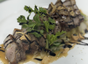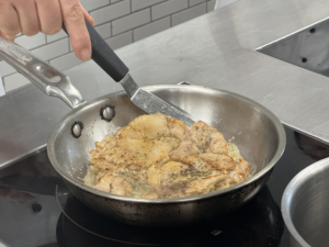 在课程的第一天,我们接触了法餐模块。法餐充满了浪漫与优雅的气息,教授的每一个动作都透露着绅士风度。我们学习了如何制作牛排块,并搭配蘑菇奶油酱。黄油在平底锅中划出一道道金黄的弧线,牛排一入锅,油花便噼啪作响,宛如一场迷你烟火表演。我紧握锅柄,手腕不由自主地想要颠勺。助教老师精通中、英、韩三语,他屈起指节轻敲锅沿,提醒道:“聆听那滋滋声,待到牛排沉入锅底再翻面。”那天,由于自己的疏忽,我不幸被烤盘的高温烫伤了手指。幸运的是,助教老师迅速带我前往医务室进行了处理,没有留下任何疤痕。到了午餐时间,当我咬下那带有玫瑰色的牛排断面,香气在舌尖绽放,所有的晨起困乏和手指的轻微疼痛立刻得到了宽恕。