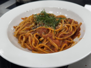 意餐教室总是弥漫着罗勒与黄油交织的香气。在制作虾仁青口贝面的过程中,老师将我们剥下的虾壳和青口贝碎片一并扫入锅中:“不要丢弃,它们还能再次发挥作用。”经过二次熬煮的海鲜汤使得面条鲜美至极,撒上欧芹碎,宛如翠绿中飘落的雪花。同时进行的还有墨鱼汁烩饭和培根奶油意面的烹饪,黄油的使用量之大仿佛毫不吝啬。法棍切片涂上黄油酱后烤至酥脆,每一口咬下去,酥脆的碎屑纷纷落下,仿佛下了一场微型的面包雪。每当老师示范完毕,我们便如潮水般涌上前去,将盘子吃得比清洗过还要干净。