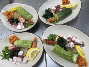 日料课堂总是沉浸在一片宁静之中,静得可以清晰地听到刀锋划过鱼肉时发出的细微声响。教授的手法精准如同量尺,挪威三文鱼在他的刀下化作半透明的花瓣,刀刃与纹理保持 45 度角的精准角度,“想象它在舌尖上融化的速度,轮到我操作时,三文鱼的切片厚薄不均,但幸运的是,三文鱼的味道始终令人满意!不论切片的厚度如何,在午餐时间我们品尝到了教授亲手制作的鲷鱼刺身鲷鱼肉质细腻,薄如蝉翼,味道美妙至极,回味中带有清甜和淡淡的海水咸鲜。茶碗蒸的制作过程最为考验人,蛋液与高汤的比例必须精确到毫升,蒸制时覆盖一张日式和纸,再扣上一只瓷碗,仿佛是在为云朵盖上被子,我的茶碗蒸表面出现了蜂窝状,助教姐姐焦急地摆手:“高汤多出一点,蒸的时间就要增加三分钟!在助教姐姐的帮助下,我的茶碗蒸最终炖出了光滑的表面,最后一天,我们制作寿司卷,鱼籽酱慷慨地铺满,剩米饭被捏成小饭团,包裹在紫菜中传递,同学们一口一个,用餐时,每位同学都带着满满一盘子寿司,享受着这美味的盛宴。