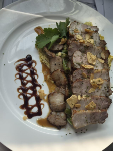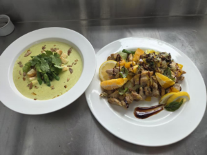 最后两天是学习以精致著称的法餐。我们做了奶油汤、柠檬奶油酱配烤鸡、整块五花肉配煎卷心菜、海鲜汤和熏鸭胸肉等。法餐给我最深的印象就是对摆盘的讲究。老师会非常细致地指导我们怎么装饰盘子,酱汁要怎么淋才好看,蔬菜要怎么摆放,颜色怎么搭配。做出来的菜确实非常上镜,拍照特别好看,当然味道也非常棒。柠檬奶油酱的清新酸味很好地平衡了烤鸡的油脂感,五花肉配煎卷心菜吃起来既扎实又不会太腻,熏鸭胸肉那种独特的烟熏风味和嫩滑的口感,都让人回味。
