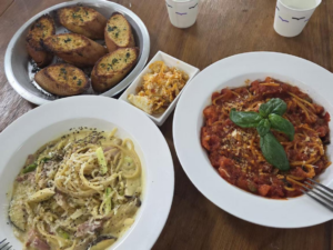 课程的后半段转向了地中海和欧洲风味。学习意大利菜那两天,我们做了芝士千层面、奶油意大利面、蒜香面包和意式烩饭。自己烤的蒜香面包香味扑鼻,比平时在西餐厅吃的前菜要香浓美味得多。而那个芝士千层面绝对是我们小组最成功的一道菜!一层层的面皮,裹着浓郁的番茄肉酱和能拉出长长丝的芝士,非常好吃。奶油意大利面的顺滑和意式烩饭那种米粒恰到好处的口感,也让我们体会到了意餐的独特魅力。