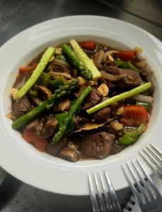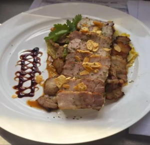 那为何说法餐是“精致的烤蒜片”呢,那是因为几乎在我们做的每一道菜的最后一个步骤,都是撒上几片烤蒜片用作装饰。此昵称由此而来。