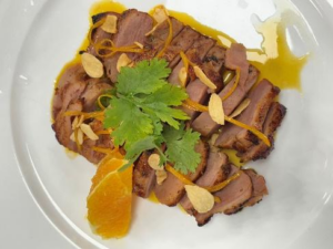 制作橙汁酱熏鸭胸时,需要将橙子皮切成细如针线的橙皮丝增添香气,切橙子皮丝是一项精细活,也是我最初最没信心的环节,我认为以我的水平一定会把橙子皮丝变成厚厚的橙子皮条的。既要削去苦涩的白色内皮,又要保证橙皮丝完整不断。第一次尝试时,我切出的橙子皮上还残留着苦涩的白色瓤肉,再次尝试后,我耐心地一点点削去白色部分,终于切出了均匀纤细的橙皮丝,当这些橙皮丝在酱汁中散发出清香时,我真切体会到“细节决定味道”的含义。