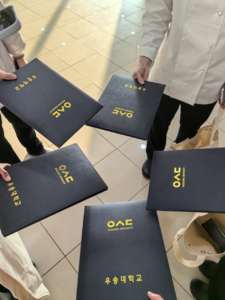 在韩国又松大学参加的两周厨艺交流项目,像一场充满烟火气的奇妙旅程,让我在美食的世界里收获技能、触摸文化,更因遇到可爱的韩国老师,多了许多温暖与感动。初到又松大学的厨艺教室,各种厨具整齐排列,空气中似有若有若无的麦香。我带着对韩国美食的好奇,对烘焙、料理的期待,忐忑又兴奋地开启这段旅程。而韩国老师们热情的笑脸、亲切的问候,瞬间打消了我的不安,就像冬日里遇到温暖的炉火,让我对接下来的学习充满期待。我记得最开始接触到的是法餐,我从前并没有太多的料理经验,对调料的量没有太多的概念,因为有语言障碍的问题,老师对我做的形容词大多只能简单形象,比如“like water”,不过跟在这句话后面最多的还是I help you”。后来,我们还学习了韩国泡菜,虽然对比之前的料理难度较低,但是却有鲜明的当地特色。制作中,从选白菜的挑剔,到抹盐、调酱料的细致,老师都一步一步耐心教。我笨手笨脚地给白菜抹盐,酱料也总涂不均匀,老师就蹲在旁边,轻轻握住我的手,一点点示范,嘴里说着“慢慢来,像这样,要让每片叶子都尝到酱料的味道呀”。在老师的帮助下,我做出的泡菜,发酵后有了正宗的酸辣味,这不仅是学会了一道菜,更触摸到韩国饮食文化里对传统的坚守,以及传承中的温暖。做巧克力麦芬时,老师严谨得像个科学家,强调面粉、黄油、鸡蛋的比例必须精准。可当我提出能不能加点坚果让麦芬更有趣时,老师眼睛一下子亮起来,笑着说“哇,这个想法很棒呀,美食就是要既有规矩,又有自己的小创意呀”。然后和我一起尝试,看着麦芬在烤箱里膨胀,香气飘满教室,老师像个孩子一样拍手欢呼,那种对美食的热爱和对学生创意的鼓励,让我明白烘焙不只是技术,更是带着温度的创作。千层面的制作复杂又有趣,面皮要擀得薄厚均匀,酱料要调得滋味交融。我在擀面皮时总是失败,老师就站在身后,用温暖的声音指导“手腕用力要均匀,就像对待生活里的难题,稳稳地、慢慢就好”。组装千层面时,老师会念叨着“这一层是生活的基础,那一层是惊喜的味道,就像我们的交流,要把不同的美好叠在一起”。当千层面在烤箱里变得金黄,老师开心地给我比大拇指。这两周,韩国老师们不仅教我厨艺,更用他们的热情、耐心和对生活的热爱感染我。他们会在休息时,给我们分享韩国的美食故事、街头趣事,会在我因为做不好菜着急时,温柔地安慰“没关系呀,失败也是美食的一部分,再试一次就好”。他们的笑容、他们的鼓励,让异乡的学习时光满是温暖。通过这次项目,我学会了韩国泡菜、巧克力麦芬、千层面等美食的制作,更理解了不同饮食文化的魅力。但最珍贵的,是遇到这样一群可爱的韩国老师,他们让我明白,美食连接的不只是味蕾,更是人心。这段经历,会成为我记忆里温暖的片段,提醒我无论何时,都要像老师们一样,带着热爱去拥抱生活、传递美好。烟火会散,但厨艺学习里的成长、老师给予的温暖,永远留在心底,成为我继续探索美食、拥抱世界的动力。